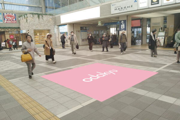 人流が集中する改札前床面を活用した、利用者に高い認知を獲得できるフロア広告です。